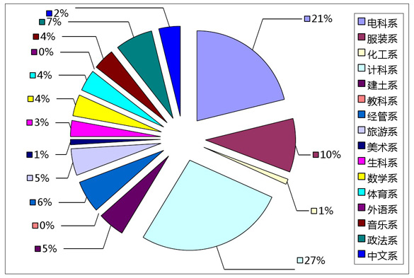 第九届计算机协会招新情况统计(性别、系别) 发布日期: Warning: Use of undefined constant Y年n月d日 - assumed 'Y年n月d日' (this will throw an Error in a future version of PHP) in /www/wwwroot/hzuca.com/wp-content/themes/hzuca/single.php on line 12 2012年10月03日 所属分类:事务公开 本届计算机协会共招收会员104人。其中男会员65人,女会员39人。所占比例分别为62.5%和37.5%。 会员所在系分布情况前三的系分别是计科系28人、电科系22人、服装系10人,具体分布如下图所示,: 会员所在系分布情况统计如下: 第九届计算机协会招新情况统计(性别、系别)总图: